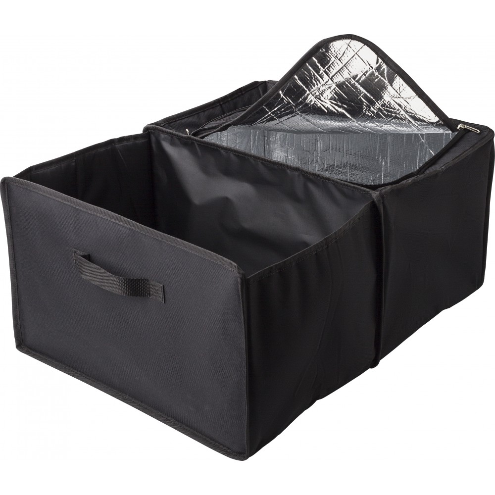 Autós rendező. Két rekesz, amelyből az egyik egy cipzárral zárható hűtőtáska alu szigeteléssel. Laposra hajtogatható. 600D poliészter.