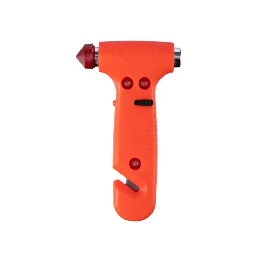 ABS vészkalapács, fehér LED lámpával (be/ki), integrált biztonságiöv-vágóval és ablakkalapáccsal. A kalapács gumiheggyel védett. Barna kartondobozba egyedileg csomagolva érkezik.