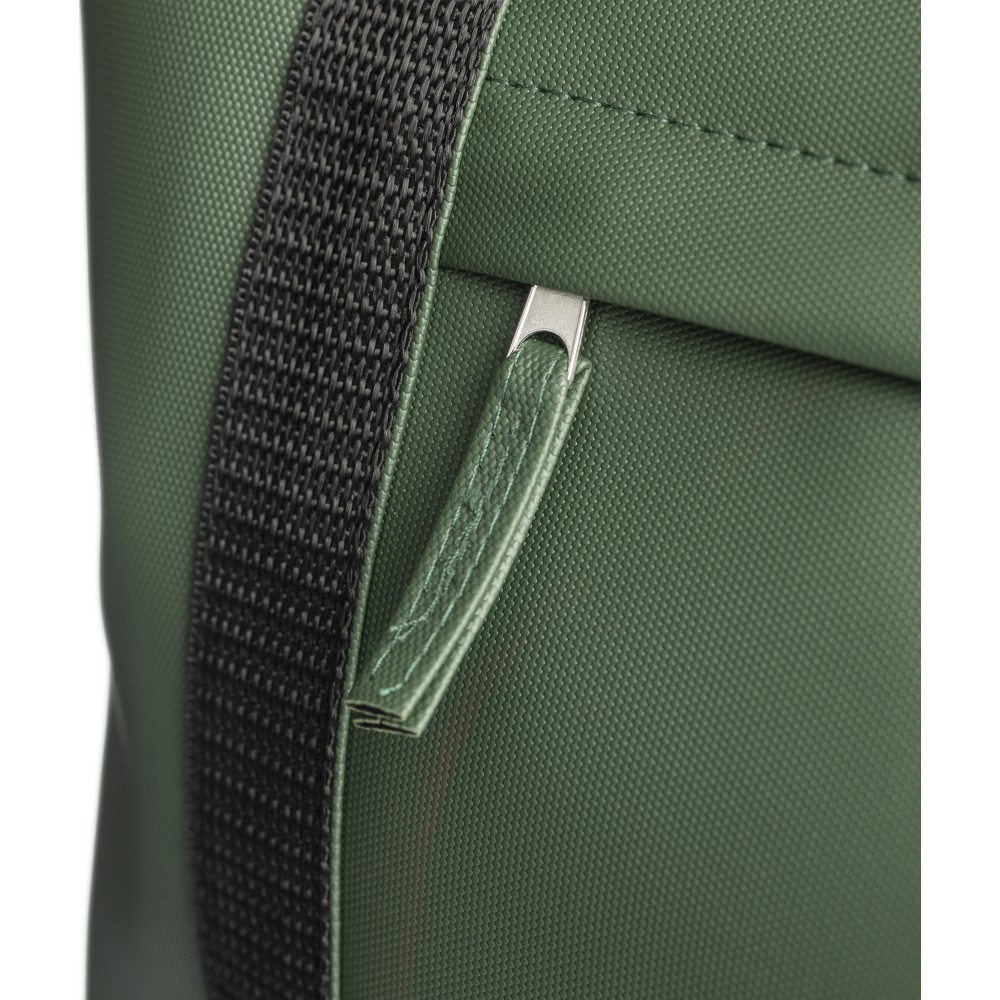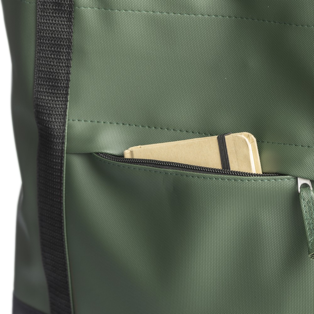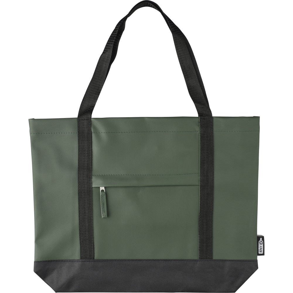 600D rPET poliészter bevásárlótáska. Mindkét oldalon PU bevonat teszi vízlepergetővé. Első cipzáras zsebbel, kicsi, belső cipzáras zsebbel és hosszú hordozófüllel. Kapacitása 10 liter. Oldalán rPET címkével.