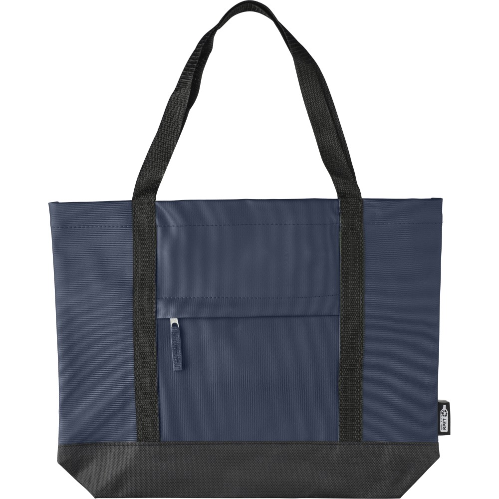 600D rPET poliészter bevásárlótáska. Mindkét oldalon PU bevonat teszi vízlepergetővé. Első cipzáras zsebbel, kicsi, belső cipzáras zsebbel és hosszú hordozófüllel. Kapacitása 10 liter. Oldalán rPET címkével.