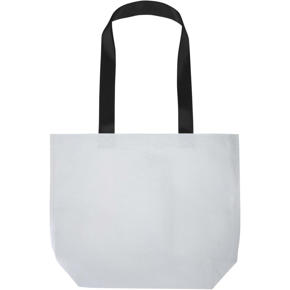 Duplán laminált aljú bevásárlótáska 150 g/m2 súlyú, GRS tanúsítvánnyal rendelkező, újrahasznosított RPET anyagból készül. A dupla laminálásnak köszönhetően a táska fokozott tartóssággal és vízlepergető tulajdonságokkal rendelkezik, így megbízható megoldást nyújt a mindennapi használat során. A termék tágas, nyitott főrekesszel, megerősített hordfülekkel és extra kapacitást biztosító széles alsó résszel rendelkezik. A 18 literes űrtartalmú táska teherbírása 10 kg, így esztétikus és praktikus választás bevásárláshoz, szakvásárokra vagy reprezentatív céges eseményekre. Az újrahasznosított alapanyag révén kiválóan alkalmas öko-szemléletű emblémázott ajándéknak.