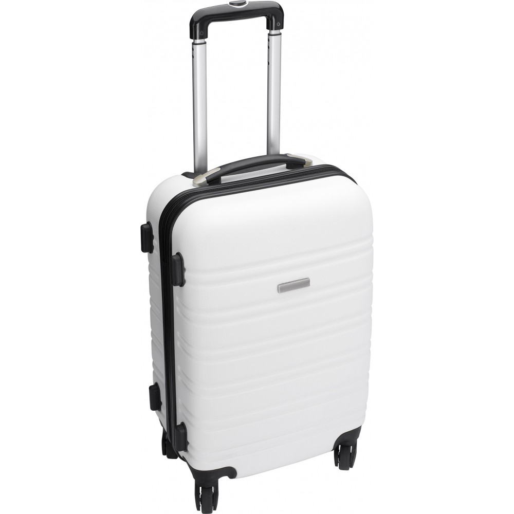Keményfedelű bőrönd ABS műanyagból, 4 körbeforgó kerékkel, beépített számzárral. Emblémzásra alkalmas fémlapot tartalmaz.
