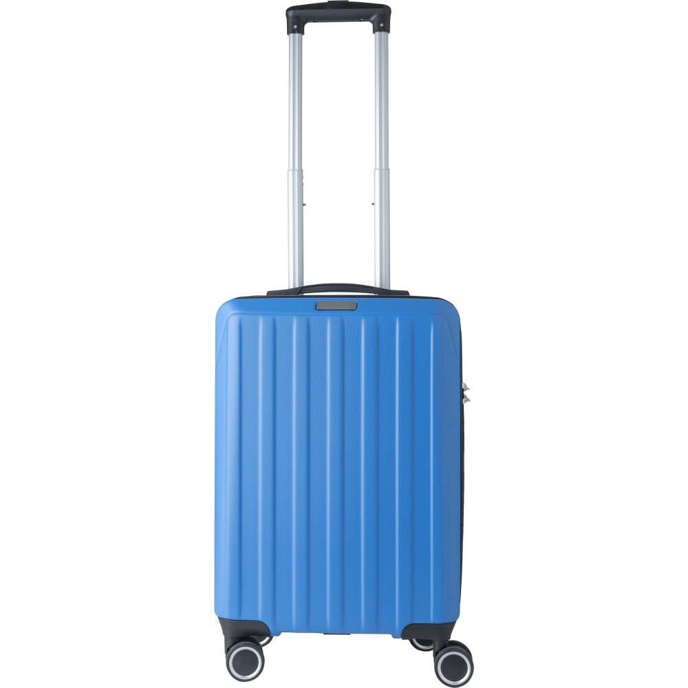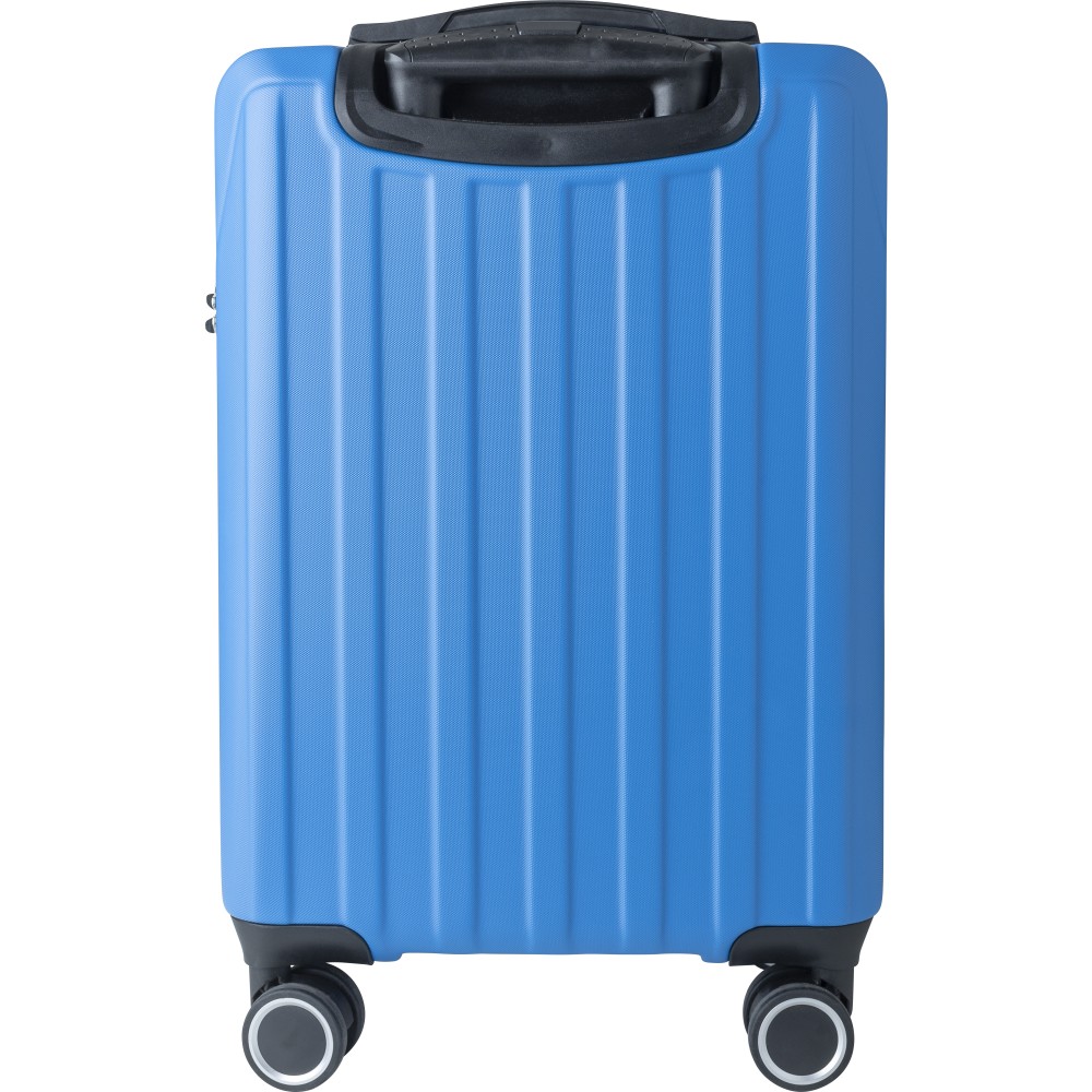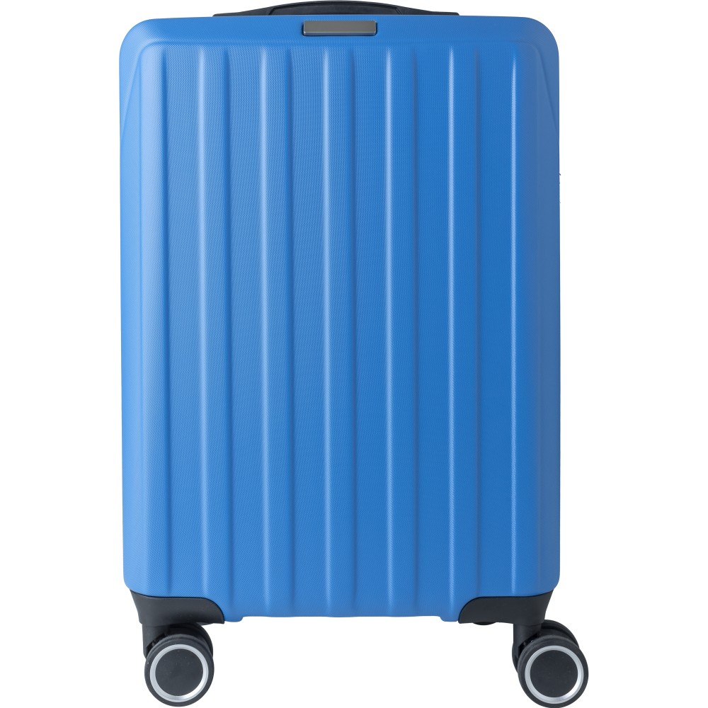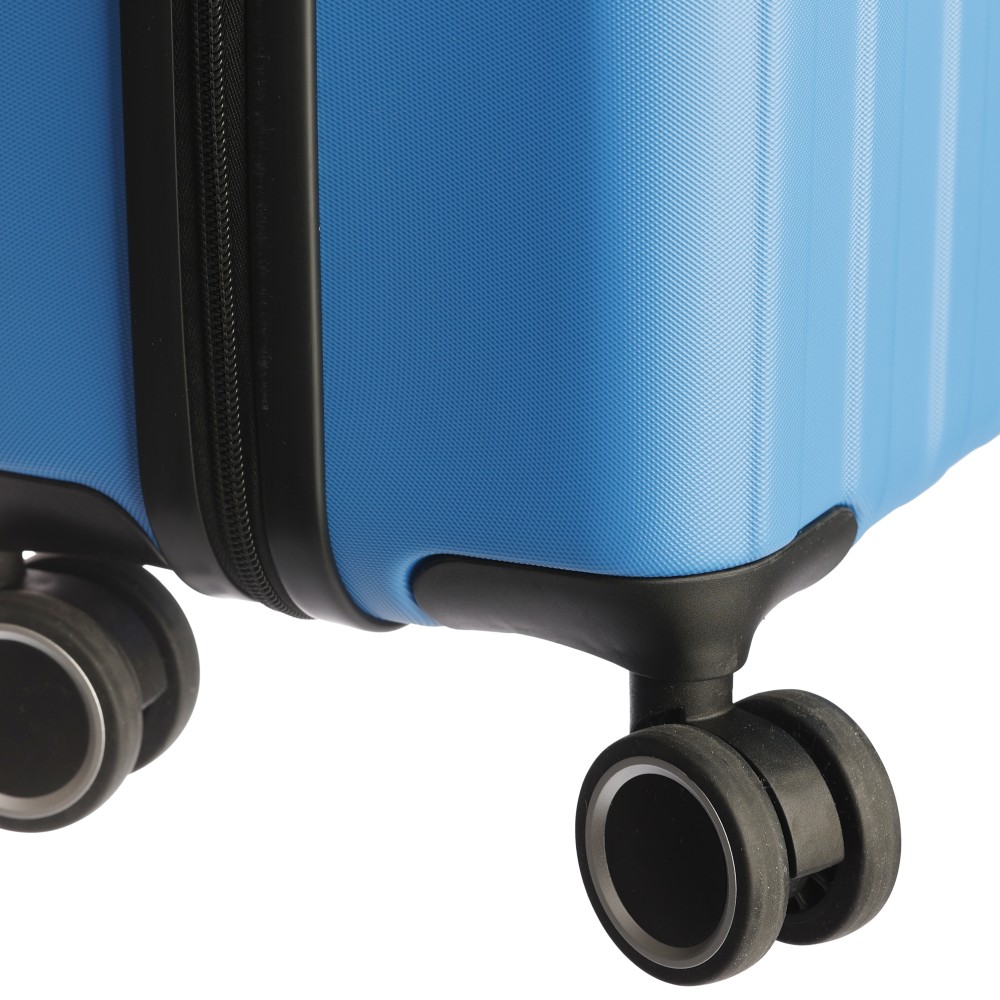 Keményfedeles ABS gurulós bőrönd 8 kerékkel (4x2), és háromszintű fém fogantyúrendszerrel. Felső műanyag fogantyút, számkombinációs zárat és 3M ragasztócsíkkal rögzíthető gravírozható táblát tartalmaz. A belső bélés anyaga 210D, a táskán belül 3 rekesz áll rendelkezésre: U-cipzáras zseb, hálós zseb és X-alakú, csattal záródó gumis heveder. Űrtartalom: 30 liter. Csomagolása barna papírdoboz.