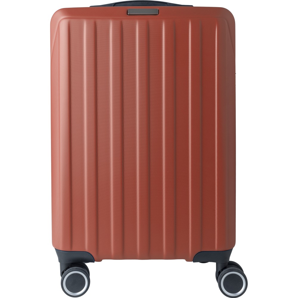 Keményfedeles ABS gurulós bőrönd 8 kerékkel (4x2), és háromszintű fém fogantyúrendszerrel. Felső műanyag fogantyút, számkombinációs zárat és 3M ragasztócsíkkal rögzíthető gravírozható táblát tartalmaz. A belső bélés anyaga 210D, a táskán belül 3 rekesz áll rendelkezésre: U-cipzáras zseb, hálós zseb és X-alakú, csattal záródó gumis heveder. Űrtartalom: 30 liter. Csomagolása barna papírdoboz.