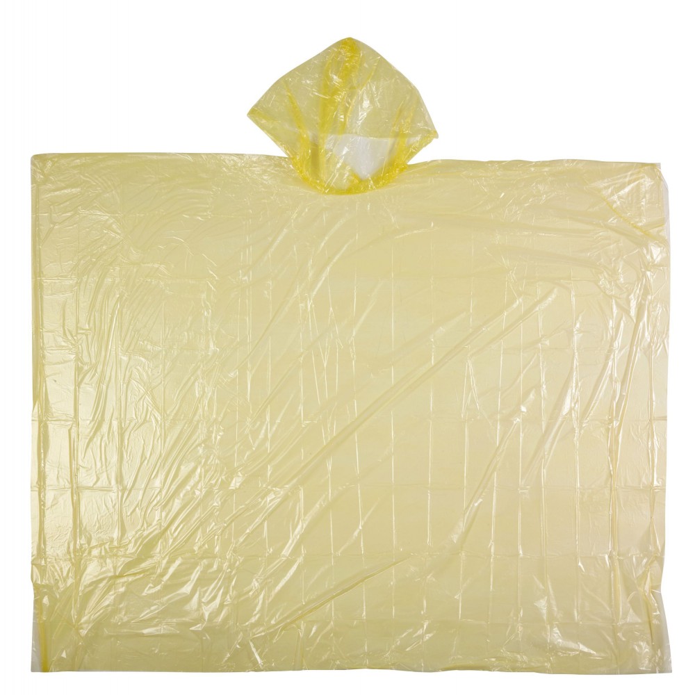 Poncsó szabású esőkabát. Áttetsző vékony PVC, anyaga emblémázásra nem alkalmas. (Egyedi feliratok az esőkabát tokjában elhelyezhető papírlapra készíthetők.) Kiterített mérete: 126*102 cm.