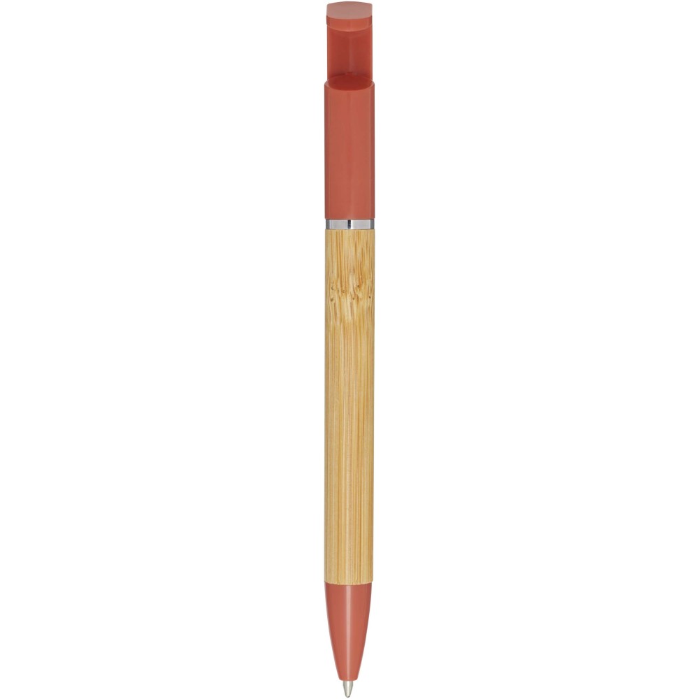 Bambusz golyóstoll, amely telefontartóként is funkcionál. A gomb és a középső gyűrű újrahasznosított műanyagból, a hegy rézből, a tollteste pedig felelősen beszerzett bambuszból készült. Kék tollbetéttel. Írási hossz: 1000 méter. Tollhegy mérete: 1,0 mm.
