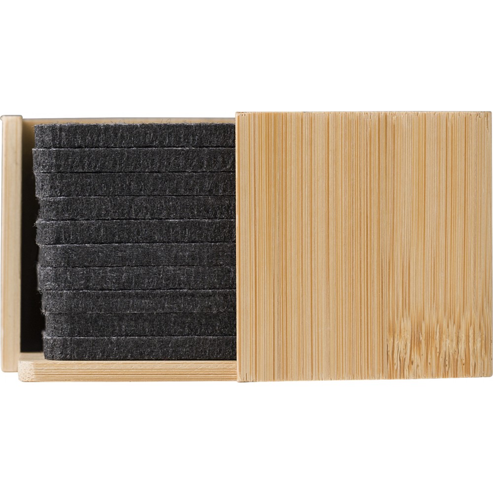 RPET filc poháralátét szett bambusz tokban. 10 darab alátétet tartalmaz. Barna kartondobozba csomagolva. Minden alátéten szerepel az újrahasznosított jel nyomata.
