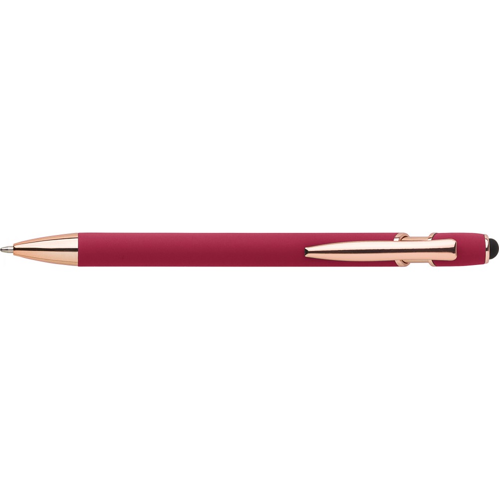 Alumínium golyóstoll rózsaarany részletekkel és érintővel, kék tollbetéttel.