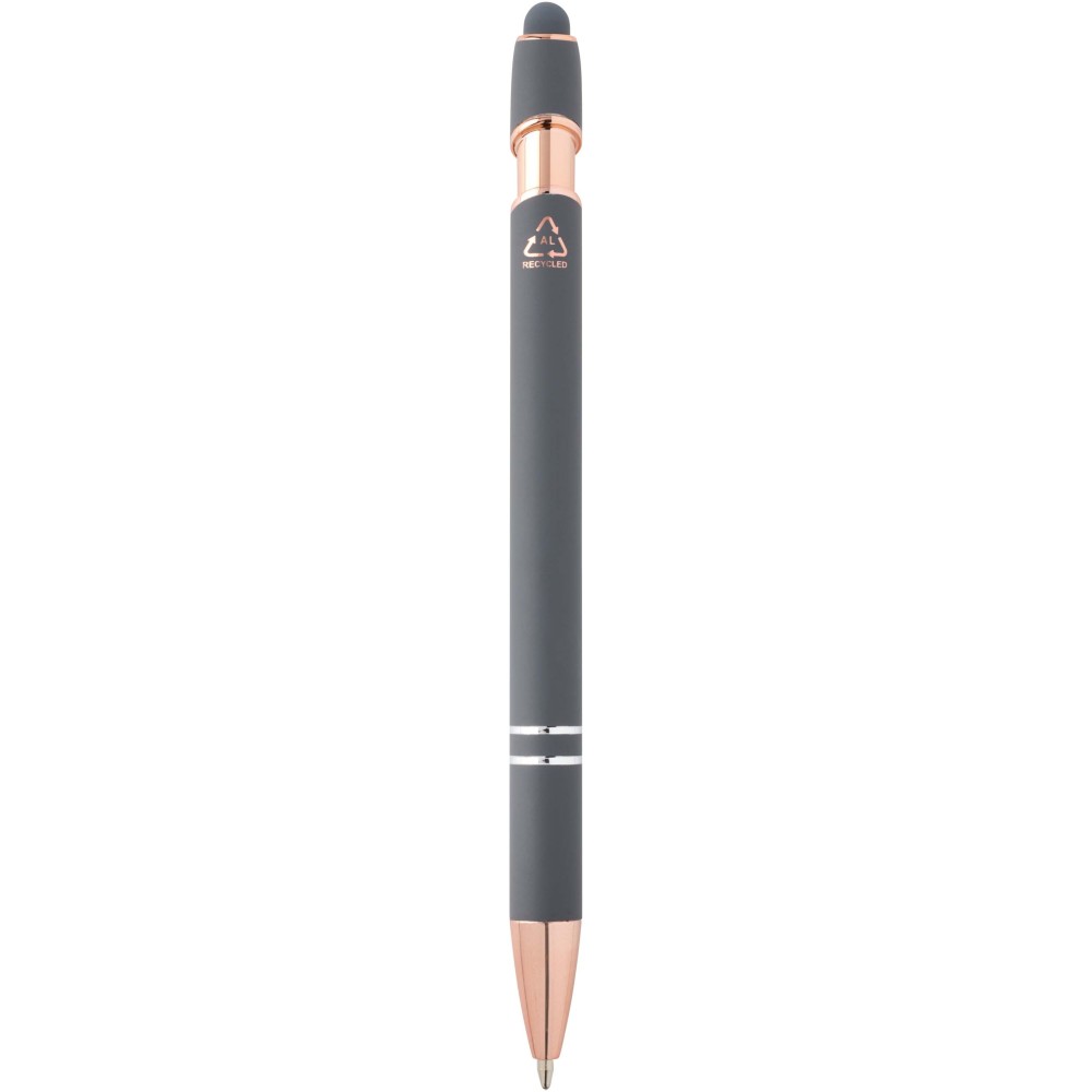 A Nanna golyóstoll rózsaarany bevonattal újrahasznosított alumíniumból készült tolltesttel és szilikon, érintőképernyős véggel rendelkezik. Az újrahasznosított alumínium csökkenti a hulladék mennyiségét a lerakókban, hozzájárul a természeti erőforrások megőrzéséhez és a károsanyag-kibocsátás mérsékléséhez. Tinta színe: fekete. Íráshossz: 800 méter. Tollhegy mérete: 1,0 mm.