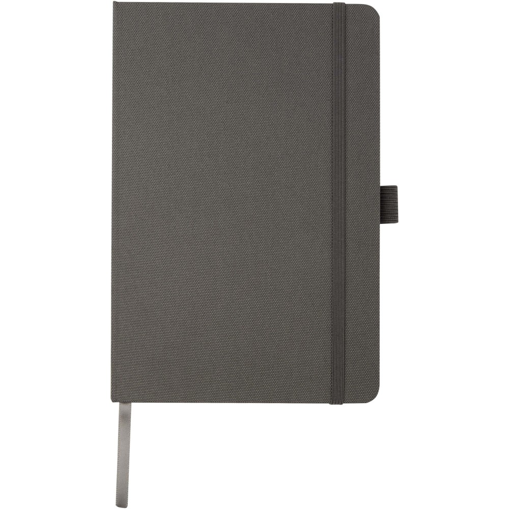 A5 jegyzetfüzet újrahasznosított PET műanyagból készült szövet borítóval. 80 lap 70 g/m2 újrahasznosított, vonalas papír, tolltartó hurok és szalag könyvjelző. Kombinálható a 107757 Honua RPET golyóstollal.