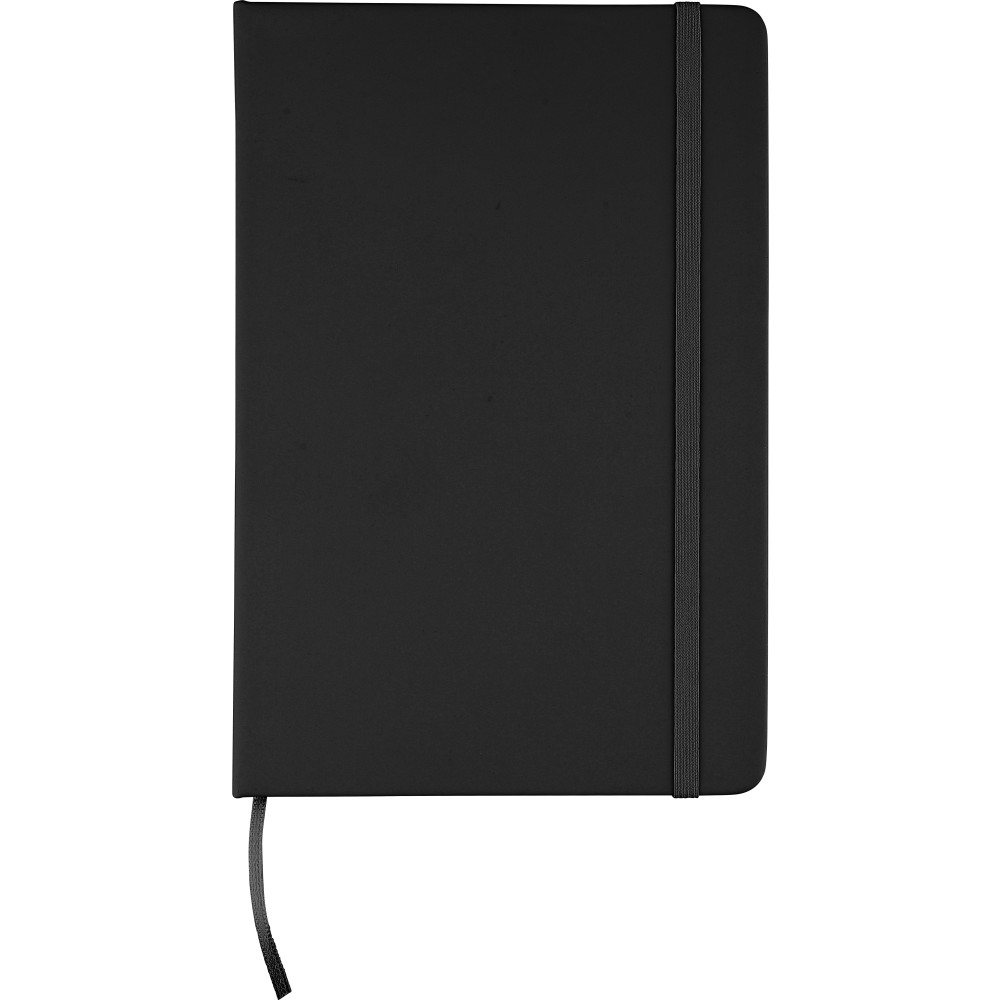 A5-ös méretű jegyzetfüzet rPET PU anyagból készült kemény borítóval, 80 vonalas lappal (70g/m2), színben illeszkedő gumipánttal és könyvjelző szalaggal. Az újrahasznosított anyagra utaló dombornyomott logóval a füzet hátoldalán.