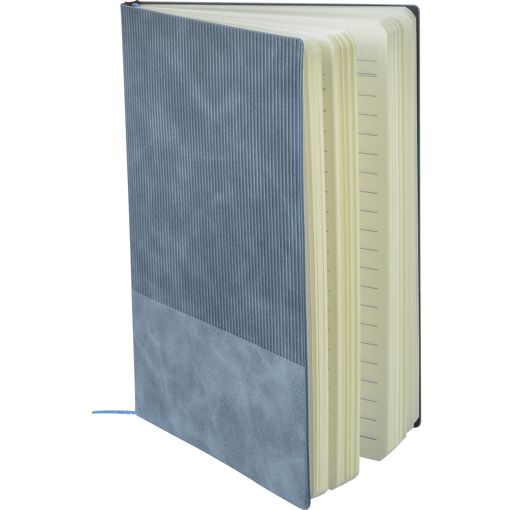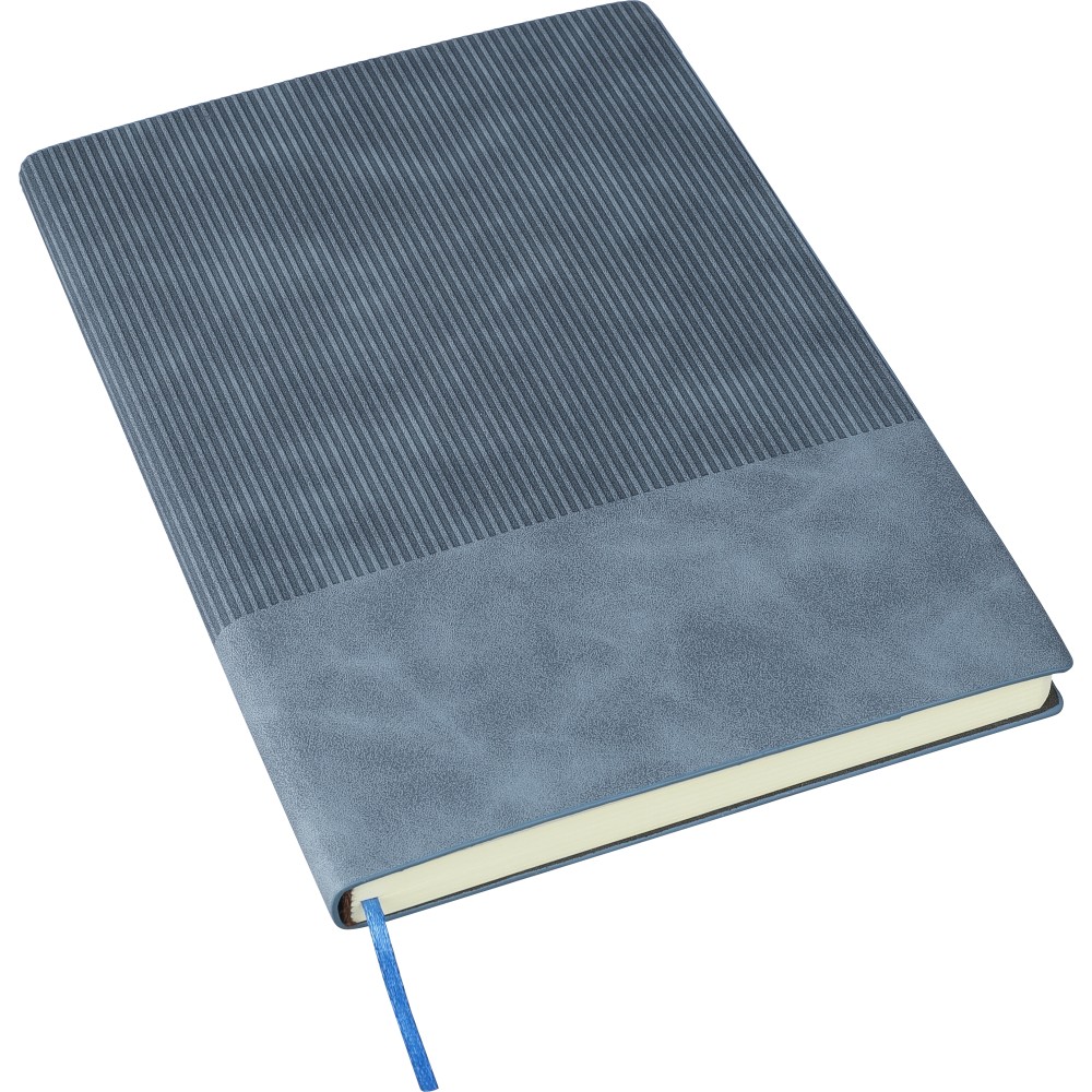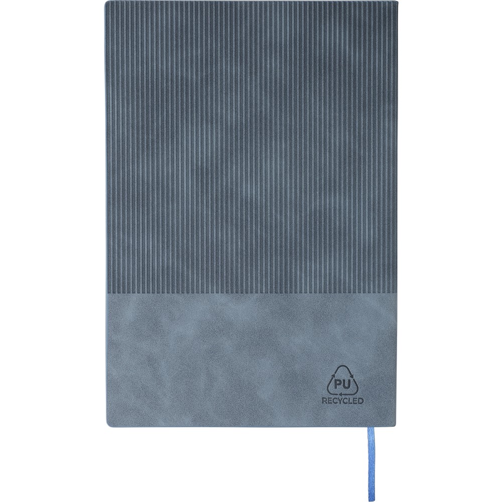 Újrahasznosított PU jegyzetfüzet, kb. A5-ös méretű, 100 lapos. Kemény borítóval és kordbársony hatású bevonattal az elülső és a hátlap felső részén. Tartalmaz egy szalagos könyvjelzőt és 80 g/m2-es vonalas lapokat. A hátoldalon dombornyomott újrahasznosított logóval.