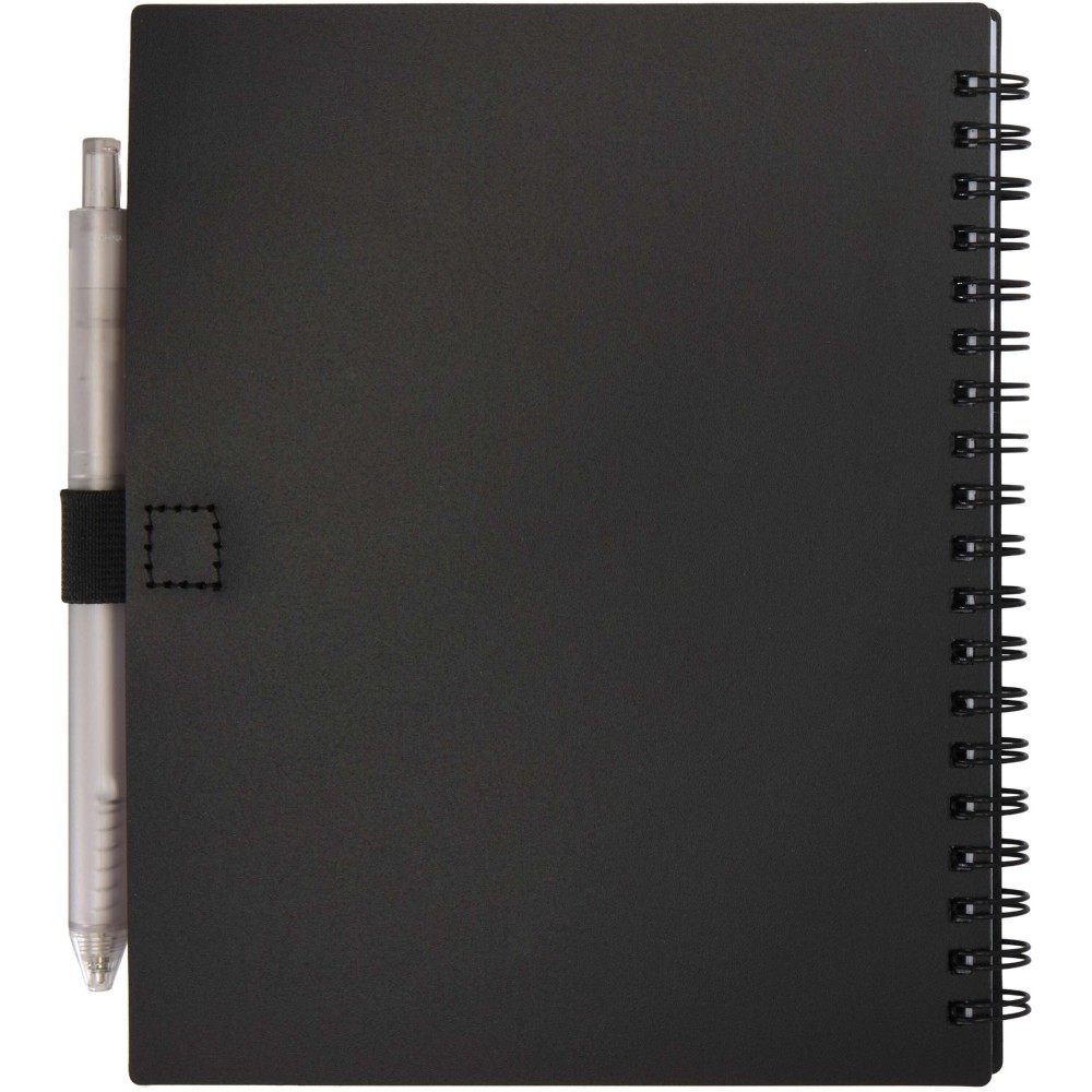 A Niove puhafedeles jegyzetfüzet újrahasznosított műanyagból készült, 70 darab, pontozott, 70 g/m2 papírlappal. A jegyzetfüzet sarkai lekerekítettek, és tolltartóhurokkal rendelkezik. Mérete: 140 × 178 mm. A golyóstoll szintén újrahasznosított műanyagból készült. Tollbetét színe: kék. Íráshossz: 1000 méter. Hegyméret: 1,0 mm.