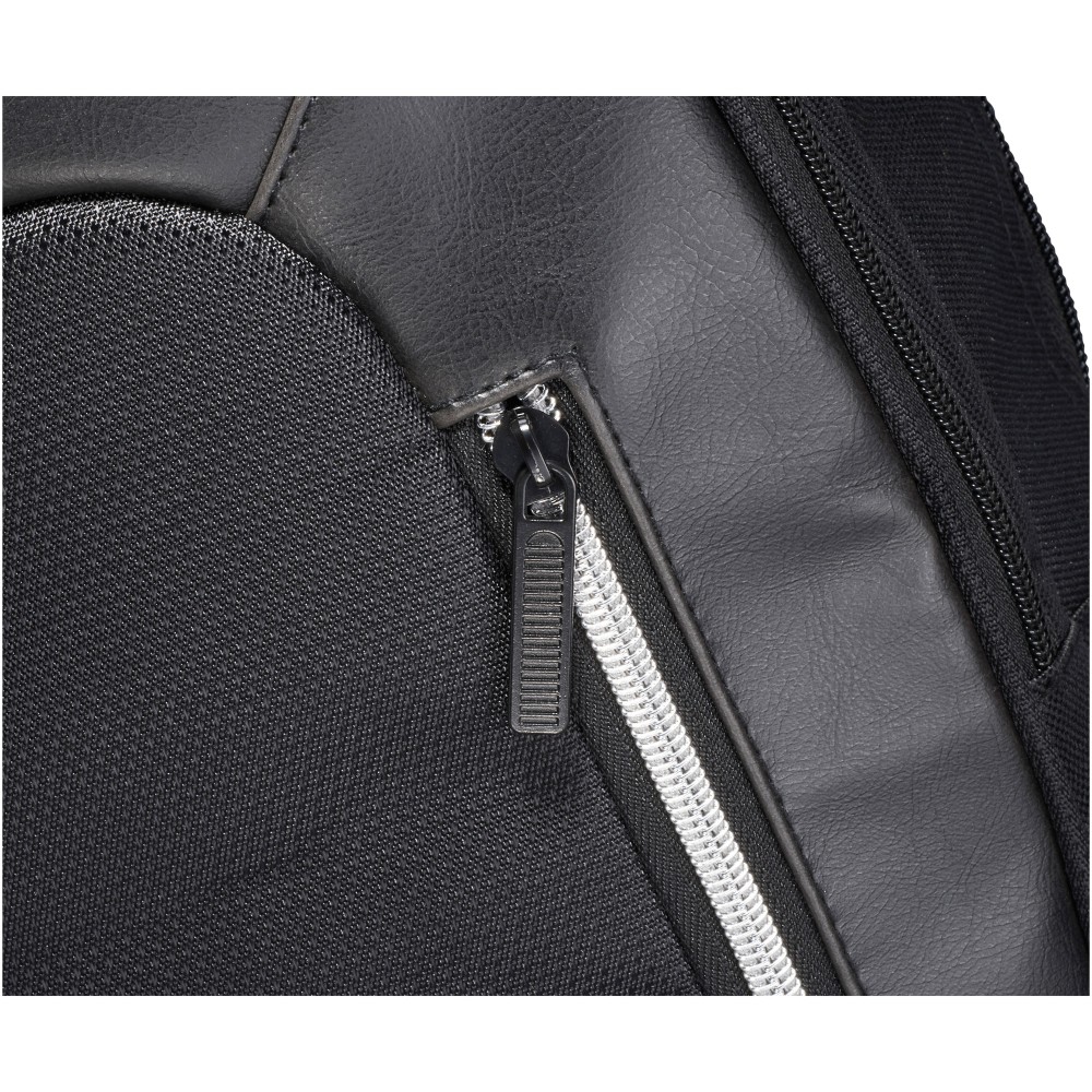 Elegáns, trendi, 15,6 -es laptop hátizsák nagy cipzáras, kulcstartós első zsebbel és rejtett RFID technológiájú blokkoló zsebbel a kártyák és okmányok adatlopás elleni védelme érdekében. A nagy, cipzáras fő tárolórész 15,6 -es laptop tárolására alkalmas, és elkölönített, párnázott résszel rendelkezik iPad vagy tablet számára. Az első, függőleges cipzár nyújt hozzáférést az első zsebhez. Két kiegészítő oldalzseb további tárolási lehetőséget biztosít, a párnázott, állítható vállpántok kényelmes viseletet nyújtanak, a hordozófül és a gurulós bőröndre húzható zseb lehetővé teszi a könnyű hordozást.