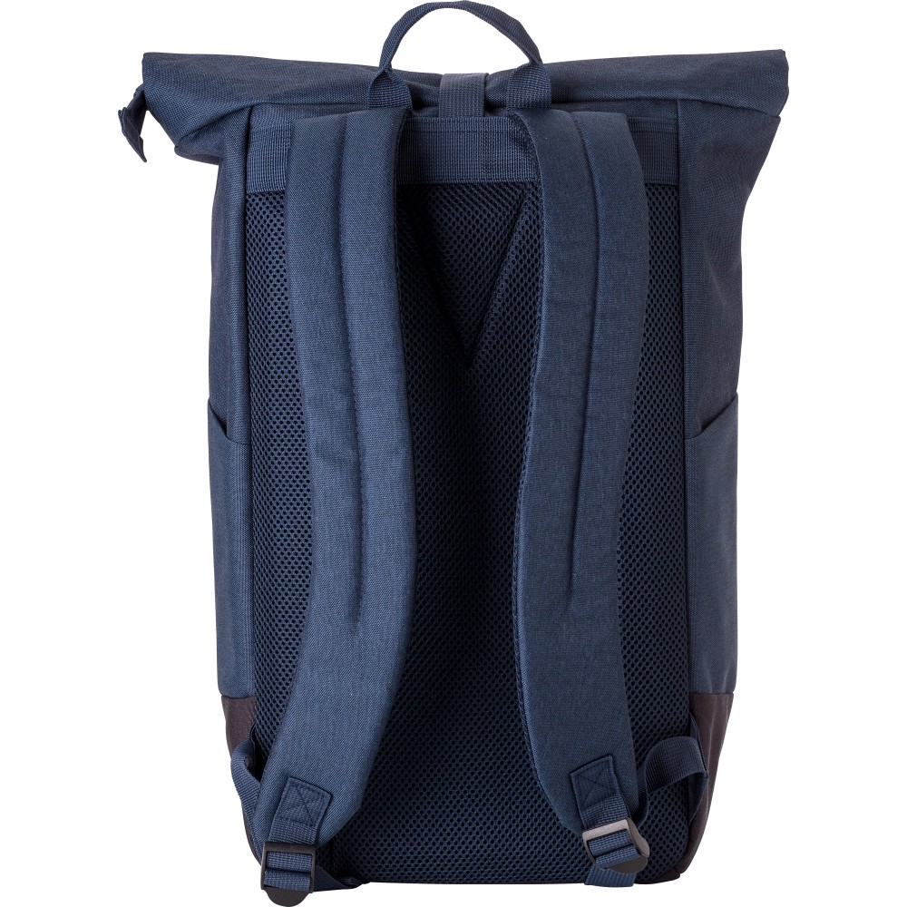 Poliészter (600D) rolltop hátizsák. Egy nagy cipzáras rekesz két csúszózsebbel és egy laptop rekesszel. Cipzáras rekesz elöl. Párnázott hátoldal és pántok. Fémhorog a záráshoz.
