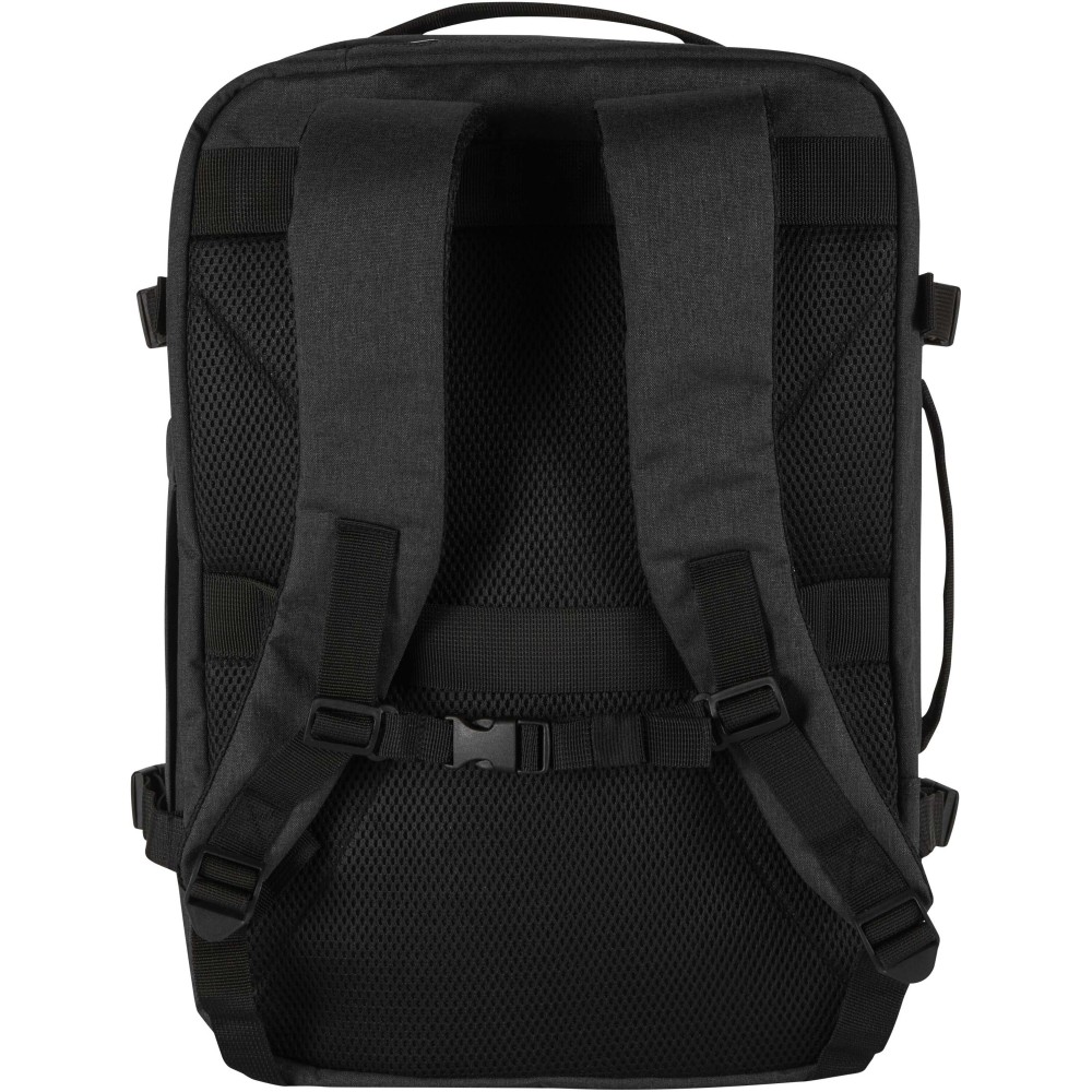 GRS tanúsítvánnyal rendelkező újrahasznosított poliészterből készült, RPET béléssel ellátott Libra hátizsák, melynek méretei megfelelnek a légitársaságok kézipoggyászra vonatkozó előírásainak. A táska egy dedikált, legfeljebb 17" méretű eszközök fogadására alkalmas laptoptartó rekesszel, valamint egy tágas főrésszel rendelkezik, amelyben rugalmas pántok és hálós elválasztók biztosítják a tartalom rendezettségét. Az elülső oldalon két nagyméretű cipzáras zseb található az alapvető kellékek gyors eléréséhez. A kényelmes viseletről és a praktikus szállításról légáteresztő hátpanel, bőröndre rögzíthető pánt, állítható vállpántok, mellkaspánt, valamint felső és oldalsó hordozófogantyúk gondoskodnak. Letisztult megjelenése és funkcionális kialakítása miatt kiváló választás üzleti utakhoz vagy irodán kívüli munkavégzéshez, miközben alapanyaga az öko-tudatosságot tükrözi.