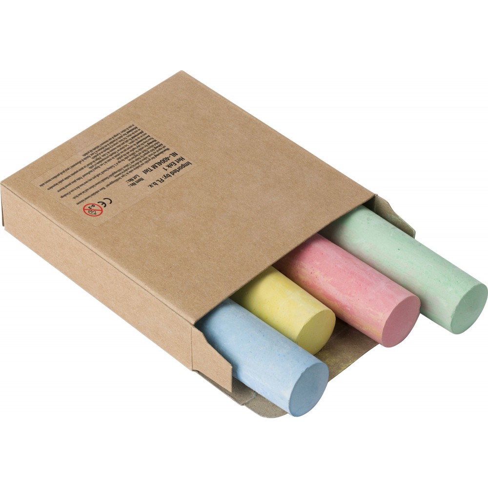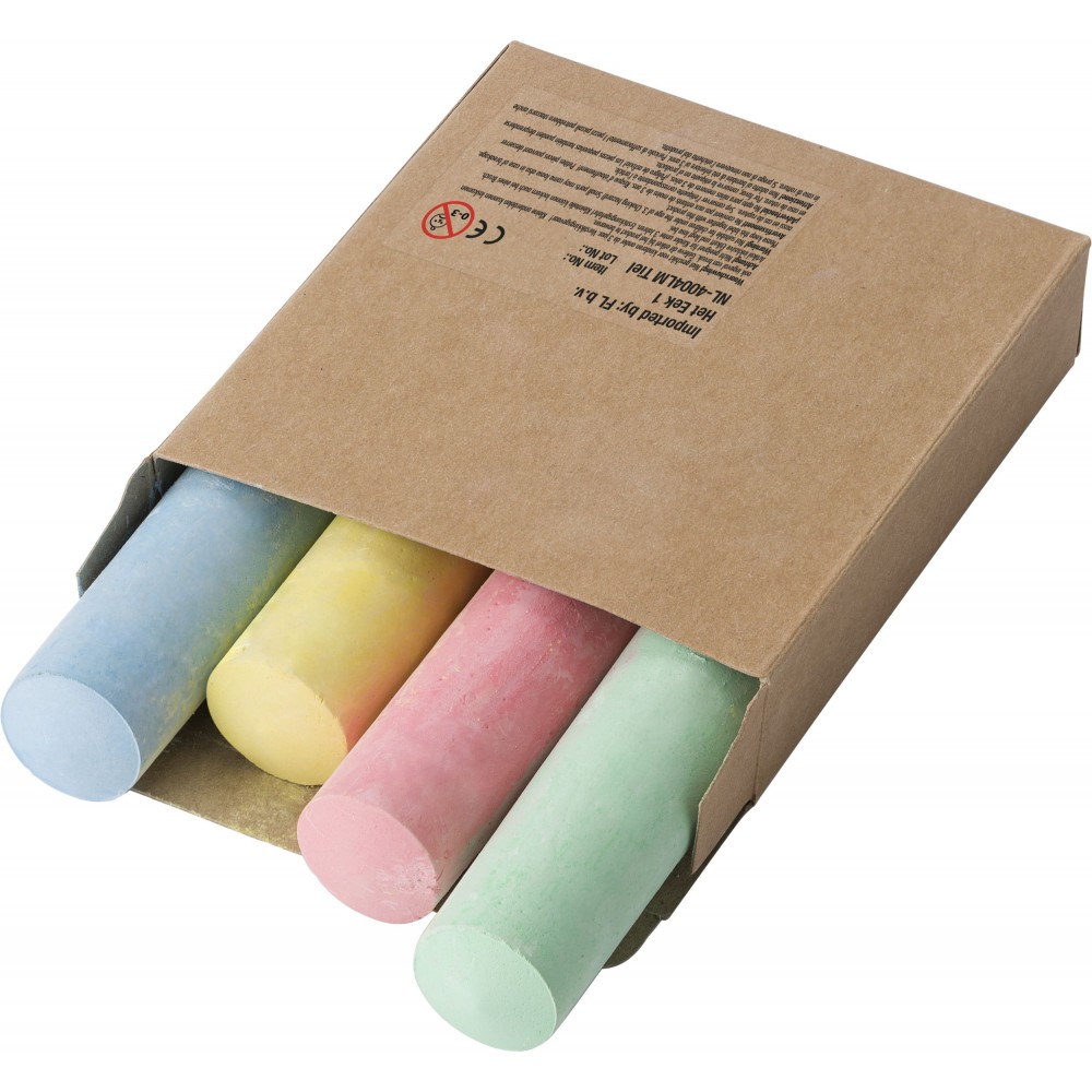 Aszfaltkréta négy színnel: zöld, kék, sárga és rózsaszín. Csomagolása barna doboz.