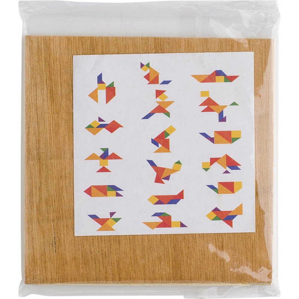 7 darabos, fa kirakójáték. Csomagolása újrahasznosított PE zacskó.