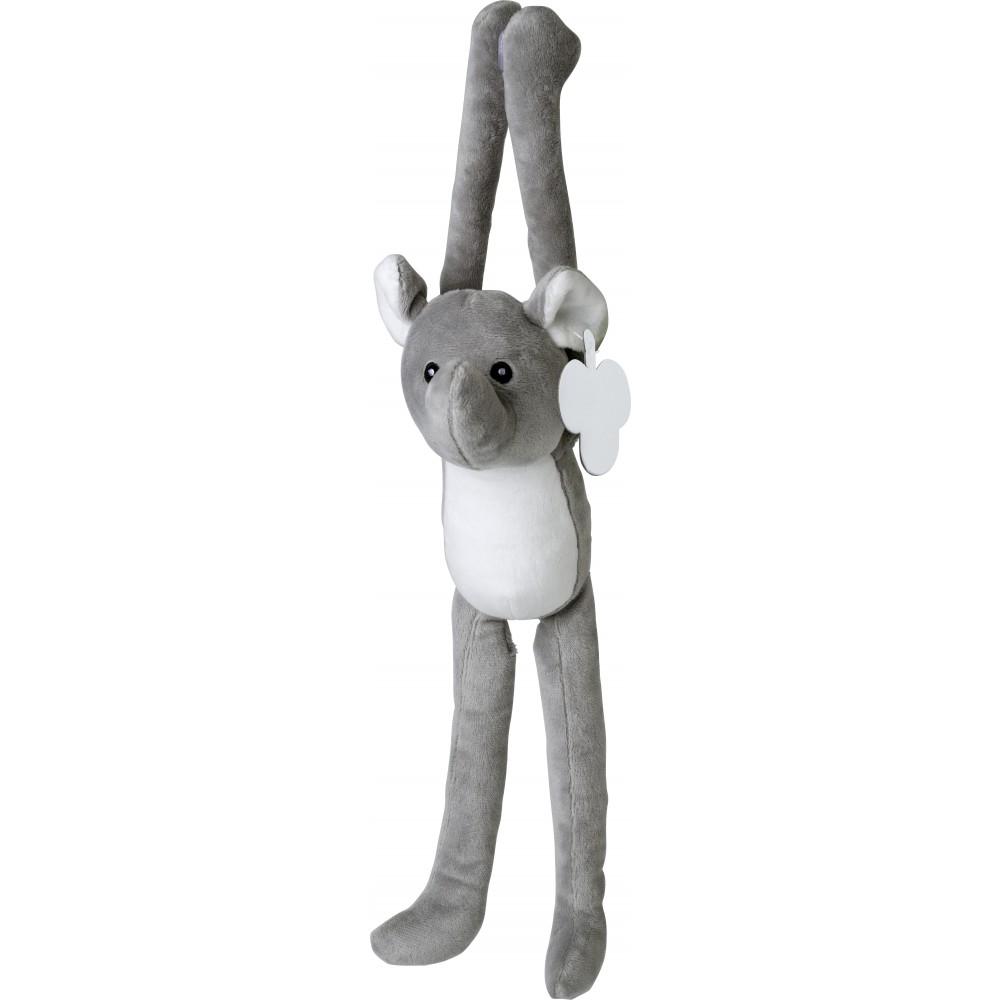 Plüss elefánt hosszú kezekkel és lábakkal, melyek végén tépőzár található. A tépőzárak segítségével textil felületeken könnyen rögzíthető. Hímzett szemek, emblémázható címke a fülben.