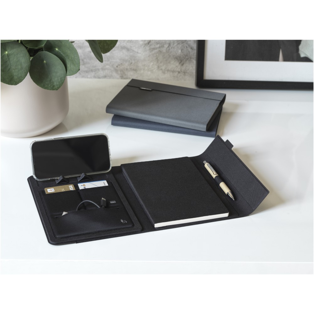 Az RCS tanúsítvánnyal rendelkező Liberto padfólió részben újrahasznosított poliészterből készül, így ez a padfólió fenntarthatóbb választás, mivel segít csökkenteni az új nyersanyag felhasználását. Tollhurokkal, harmonikazsebbel és 64 krémszínű, vonalas, fenntartható forrásból származó, 80 g/m2-es, újrahasznosított lappal rendelkezik. A képeken látható toll és egyéb kiegészítők nem tartoznak a termékhez.