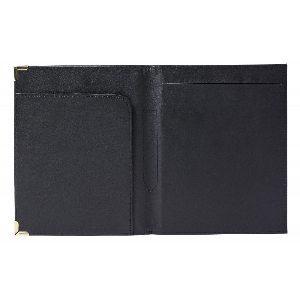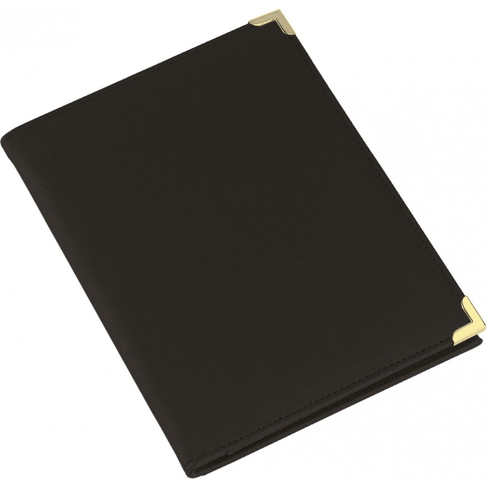 A5-ös PU mappa fém sarokkal. Jegyzettömböt nem tartalmaz. 30 vagy 50 lapos jegyzettömb fehér lapokkal a 23023 vagy 23026 cikkszámon külön rendelhető. A fekete mappa arany színű sarkokkal, a kék mappa ezüst színű sarkokkal érkezik.