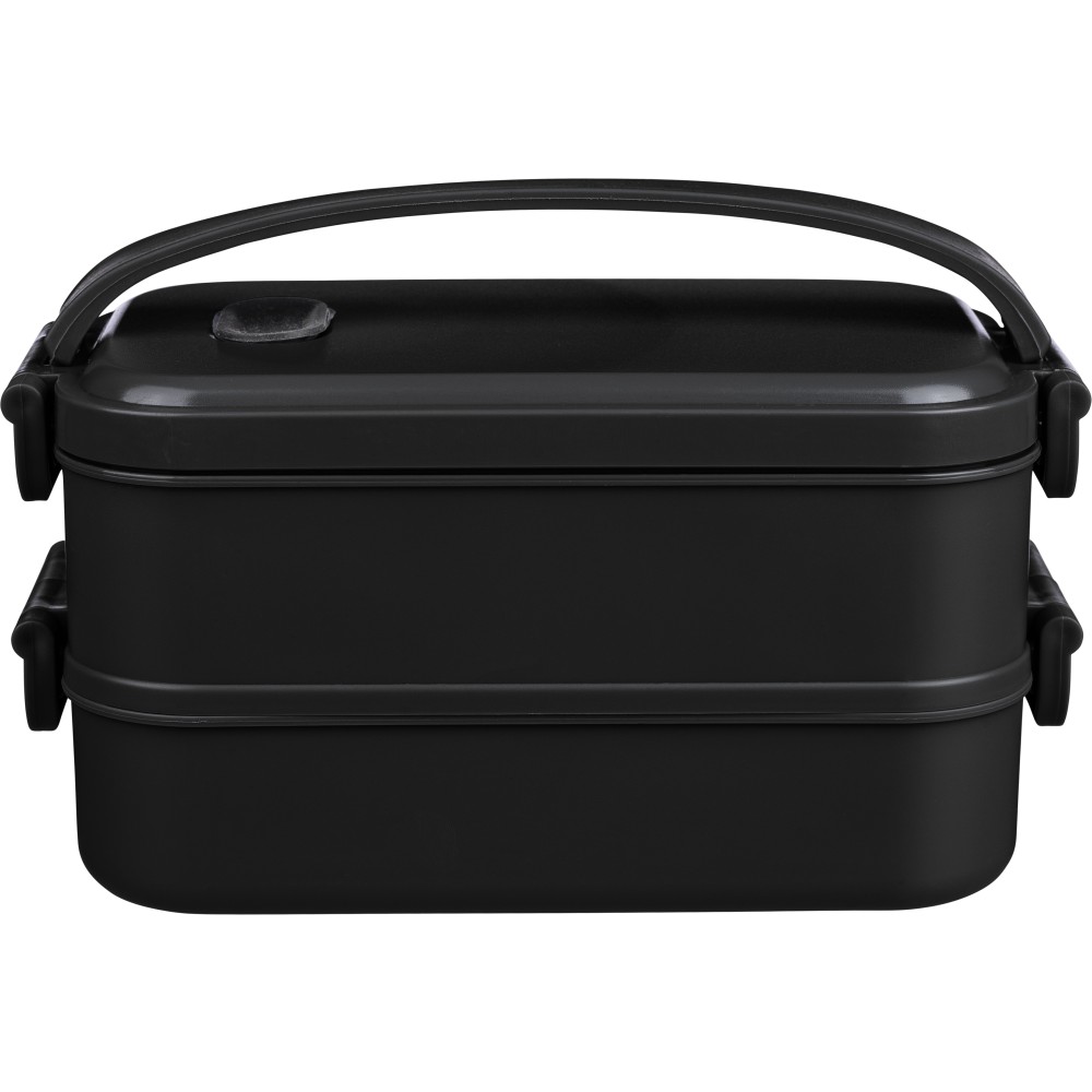 1600 ml-es PP ételtároló doboz 2 db, egyenként 800 ml-es résszel. Szilikon szeleppel a mikrohullámú sütőben történő melegítéshez, csatos záródással és szilikon hordozófüllel. Mosogatógépben tisztítható.