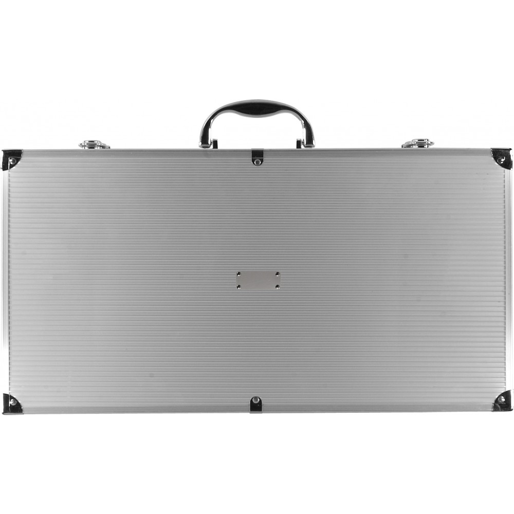 BBQ készlet fém táskában. Tartalma: nyársak, hússütő lapát, villa, kés, fogó, lapát, drótkefe és kefe.