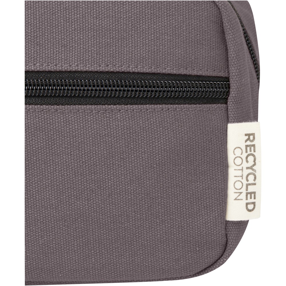 GRS tanúsítvánnyal rendelkező újrahasznosított vászonból és GRS tanúsítvánnyal rendelkező RPET béléssel készült piperetáska. Egy cipzáras elülső zsebbel és egy cipzáras főrekesszel, szervezőzsebekkel és pánttal rendelkezik. Fémlapja gravírozható. Űrtartalom: 3,5 liter.