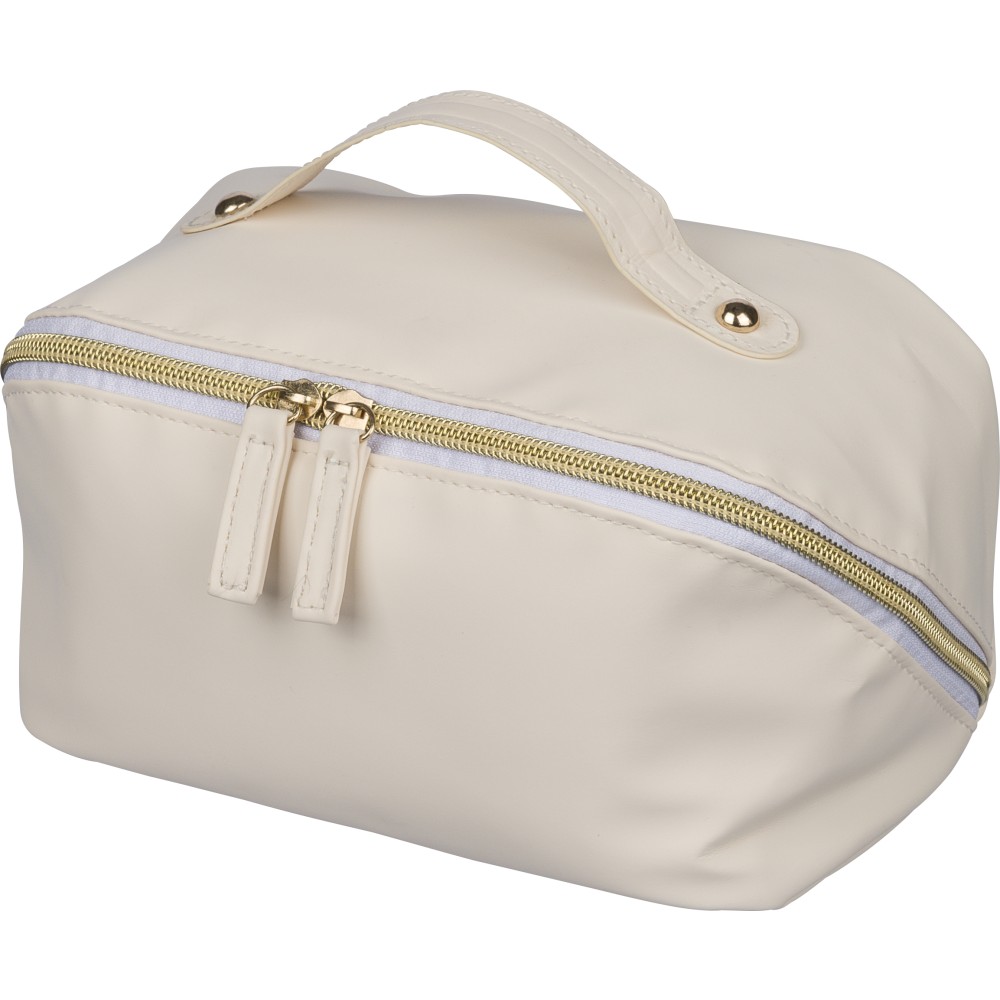 Újrahasznosított PU anyagból készült neszesszer középen elhelyezett cipzárral a széles nyithatóság érdekében. Rövid fogantyúval, tágas belső térrel és négy rekesszel, beleértve egy belső cipzáras zsebet. 210D újrahasznosított béléssel készült, belsejében egy újrahasznosított alapanyagra utaló címkével.