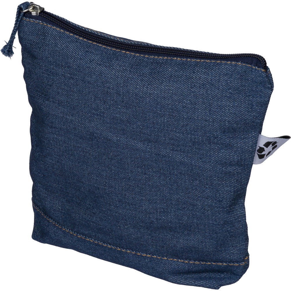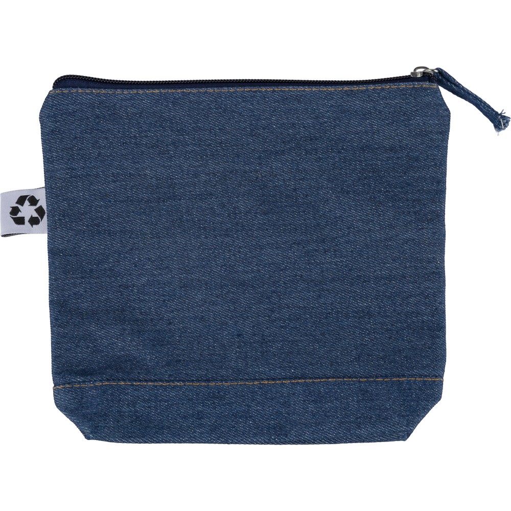 Újrahasznosított farmeranyagból készült kozmetikai táska 21 × 18,5 cm méretben, egy cipzáras fő rekesszel és a külső felületen elhelyezett újrahasznosított alapanyagra utaló címkével.