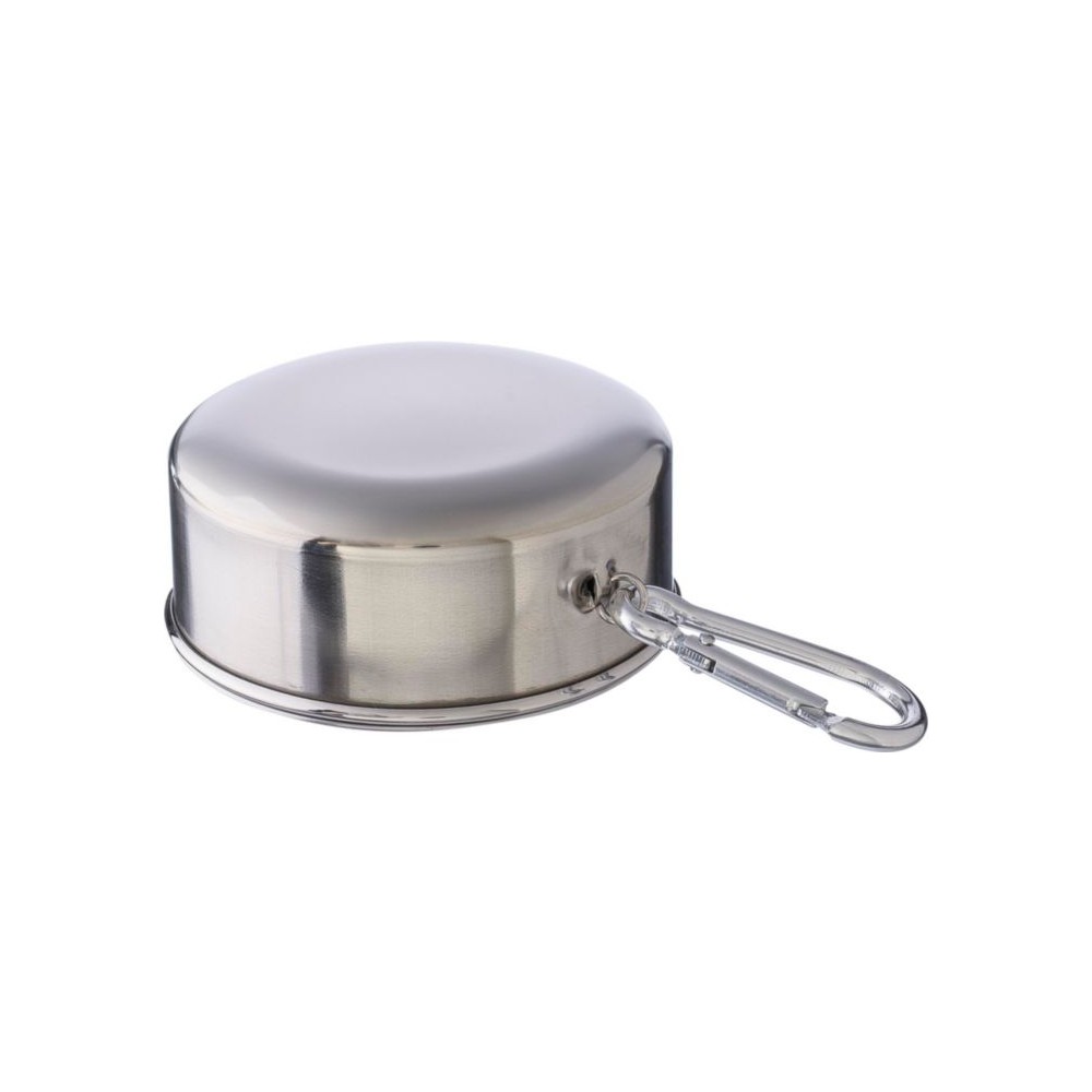 Összecsukható pohár fém karabinerrel. Egyenként barna kartondobozba csomagolva. Anyaga: rozsdamentes acél. Űrtartalom: 220 ml.