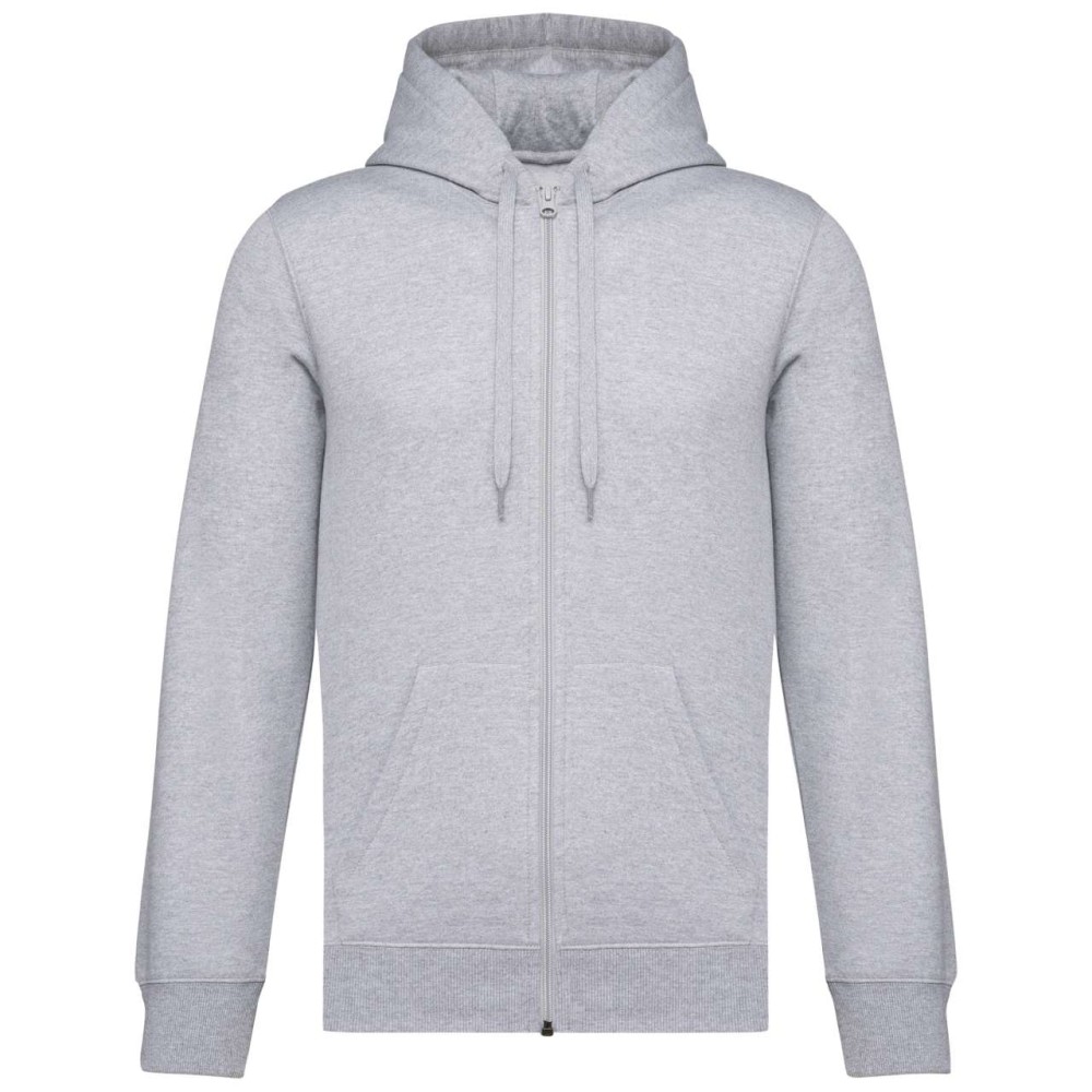 50% gyűrűs fonású pamut / 50% újrahasznosított poliészter, fésült pamut. Egyenes szabású, vágott és varrott. 1x1 bordás kötés a nyakkivágás, a mandzsetta és az alsó szegély jobb megjelenése érdekében. Kenguruzseb, nylon cipzár. Policotton dzsörzé bélésű kapucni lapos húzózsinórral. Színben illeszkedő dzsörzé szalagos belső a nyakkivágásnál. Csak méretcímke márkajelzés nélkül.