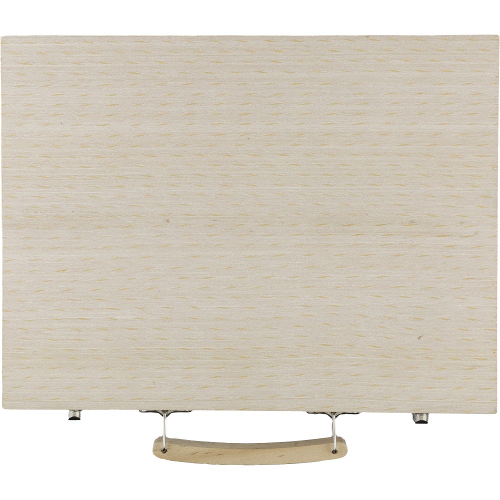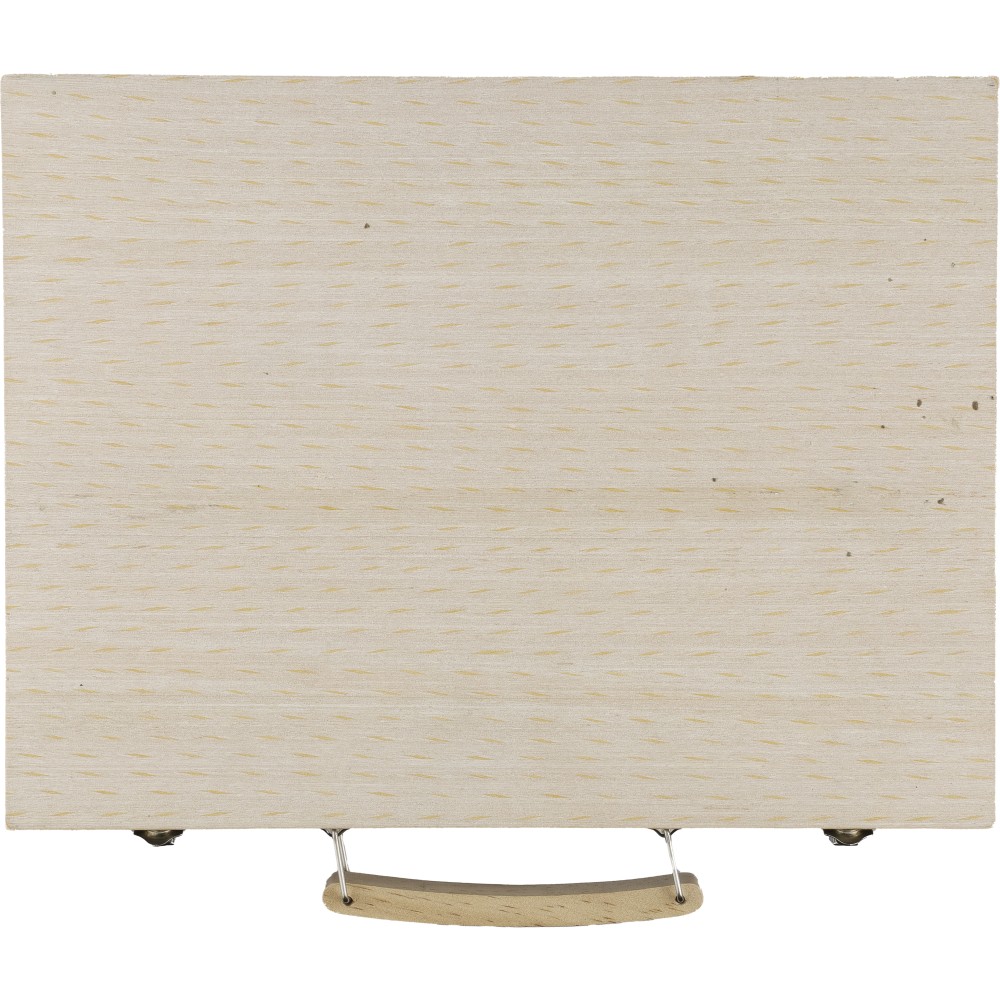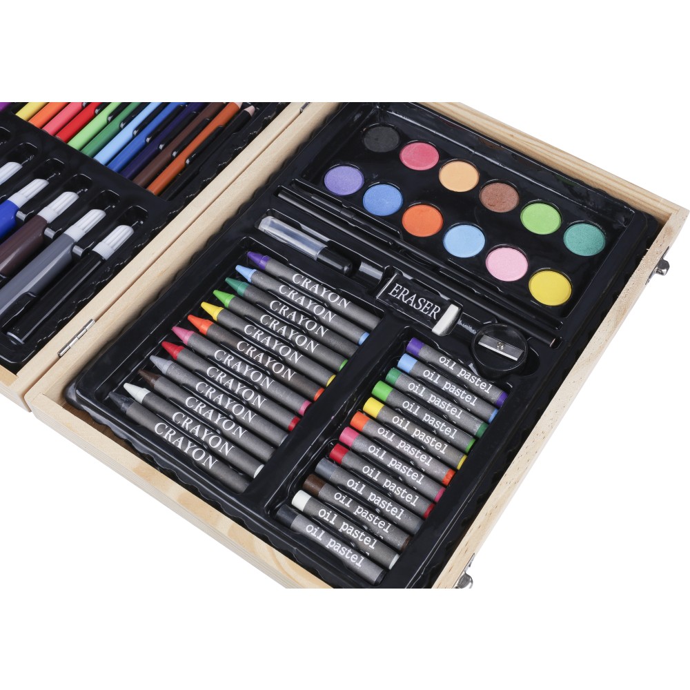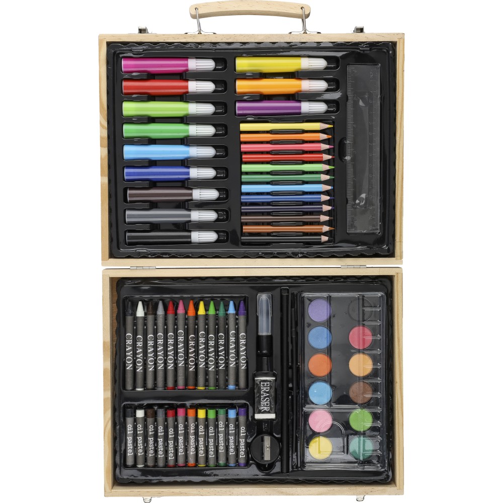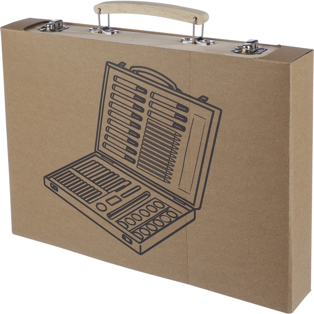 66 db-os rajzkészlet fa tartóban, fa fogantyúval. Tartalma: 12 db zsírkréta, 12 db színes filctoll, 12 db kihegyezett színes ceruza, 12 db olajpasztell kréta, 12 db festék, ragasztóstift, radír, ceruzahegyező, vonalzó, ecset és festőpaletta. Csomagolása barna papírdoboz.