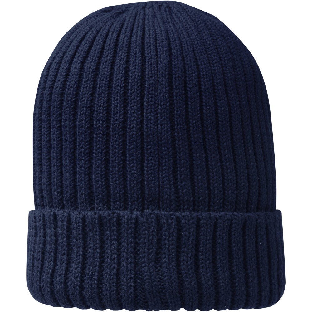 Egyrétegű sapka visszahajtókával, bevarrt márkajelzéssel. 2x2 bordás anyag. Organikus pamut.
