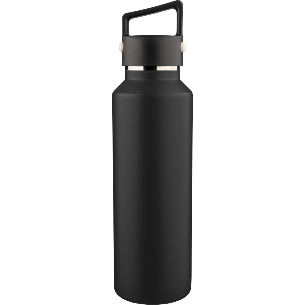Újrahasznosított rozsdamentes acélból készült, vákuumszigetelésű palack 600 ml űrtartalommal, duplafalú kialakítással, hordozófüllel ellátott PP fedéllel és kétféle (dupla) nyitási lehetőséget biztosító nyomógombos rendszerrel. A palacktesten lézergravírozott recycled (újrahasznosított) alapanyagra utaló logó található. Darabonként barna kartondobozba csomagolva.
