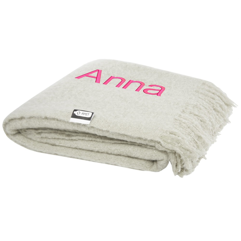 Ultrapuha újrahasznosított PET-ből készült moher takaró összefogó pánttal. A rojtok hossza: 10 cm mindkét végén. Összefogó szalag mérete: 72 x 4 cm. 215 g/m2.