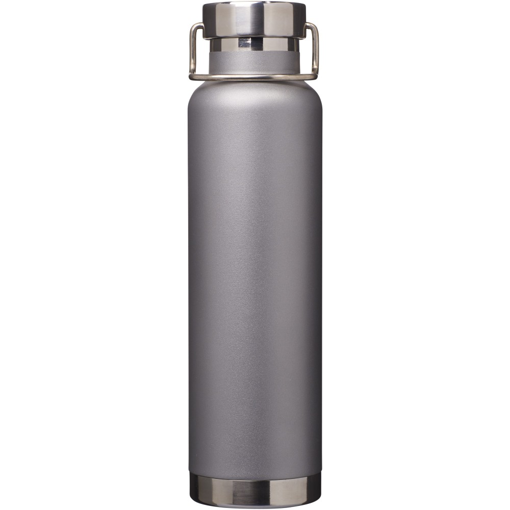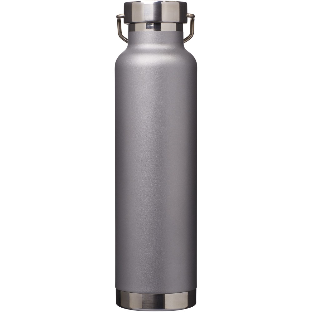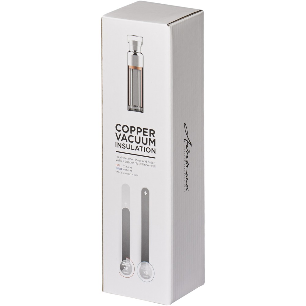 Thor duplafalú vákumos palack. Belső fala réz, ennek köszönhetően 48 órás hideg- és 12 órás melegtartási képességgel rendelkezik. Ez a kialakítás megakadályozza a kondenzációt a palack külső falán. A termoszhoz csavaros, rozsdamentes acél kupak tartozik. Széles kiöntő nyílással rendelkezik, amely akár jégkockák behelyezésére is alkalmas. Szivárgásmentes. Szénsavas italokkal nem használható. Mosogatógépben nem mosható és mikrohullámú sütőben történő melegítésre nem alkalmas. Űrtartalom: 650 ml. Csomagolása Avenue díszdoboz. Rozsdamentes acél.