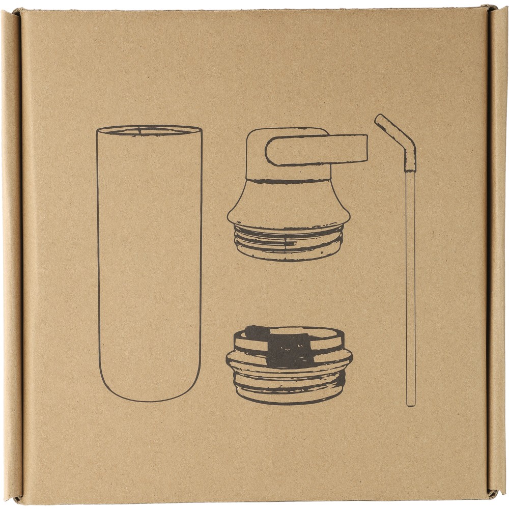 Duplafalú rozsdamentes acél kulacs (500 ml), belső anyaga 304-es rozsdamentes acél, külső része pedig 201-es rozsdamentes acél. Két tetővel szállítjuk: egy hordozófüles PP tetővel és egy átlátszó PS tetővel, amely a mellékelt rozsdamentes acél szívószállal, szilikon véggel és tartóval használható. Egyenként csomagolva, barna kartondobozban.
