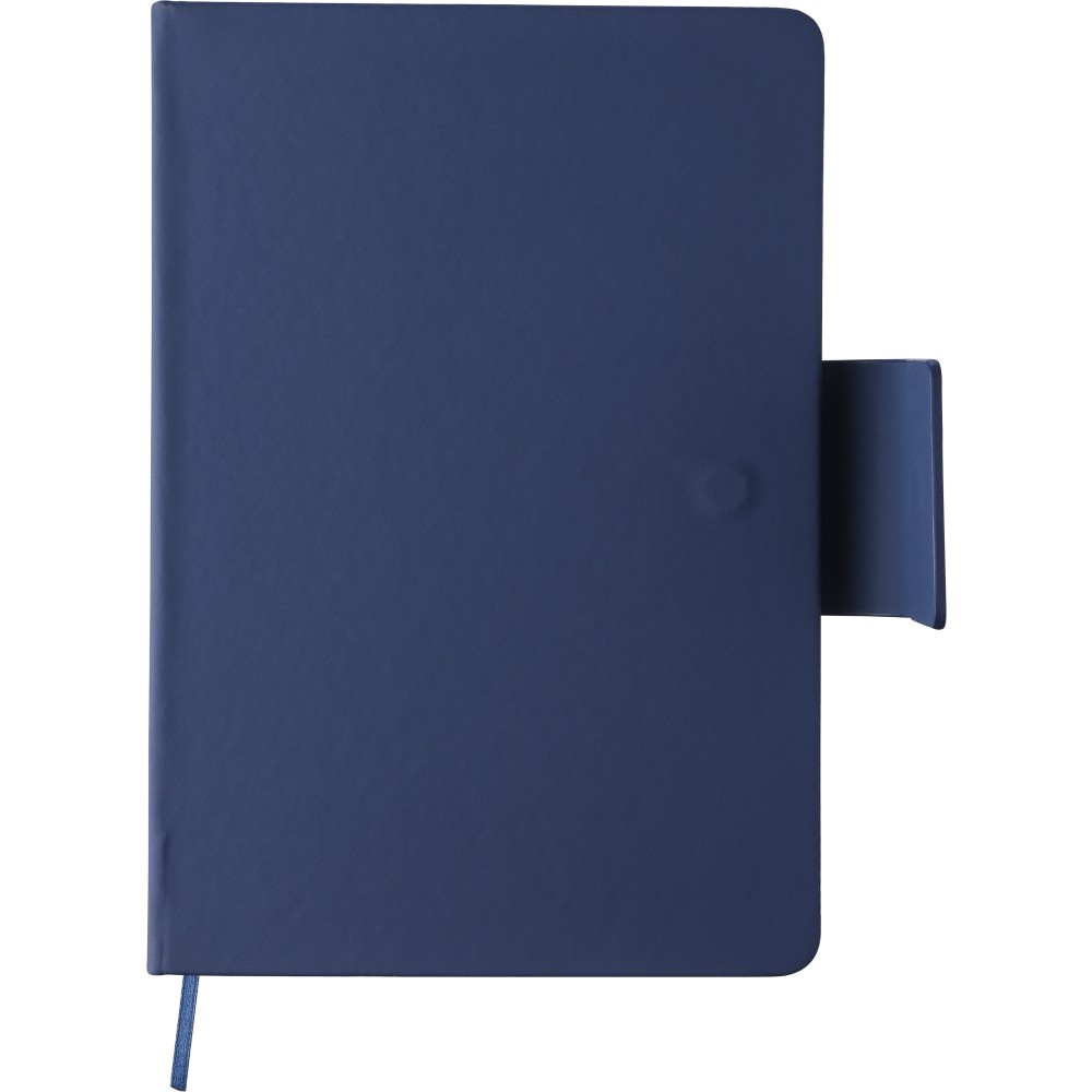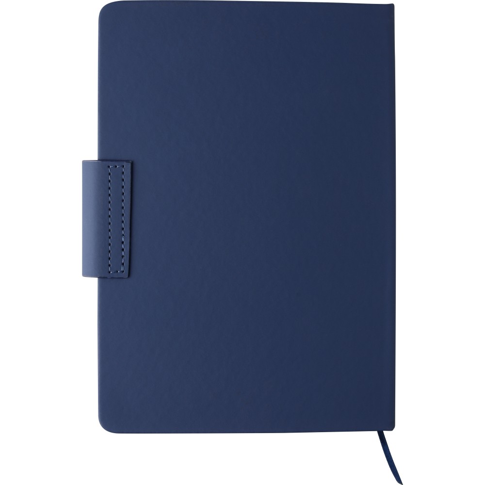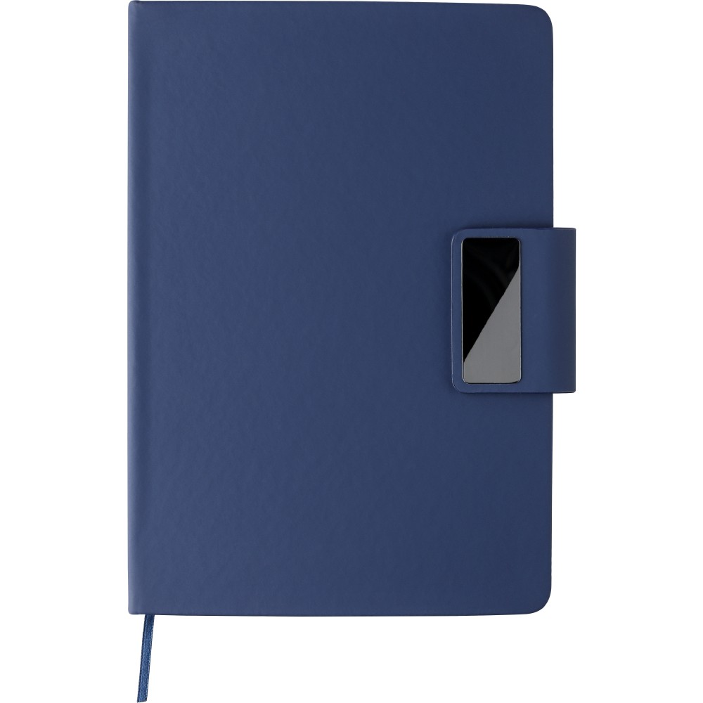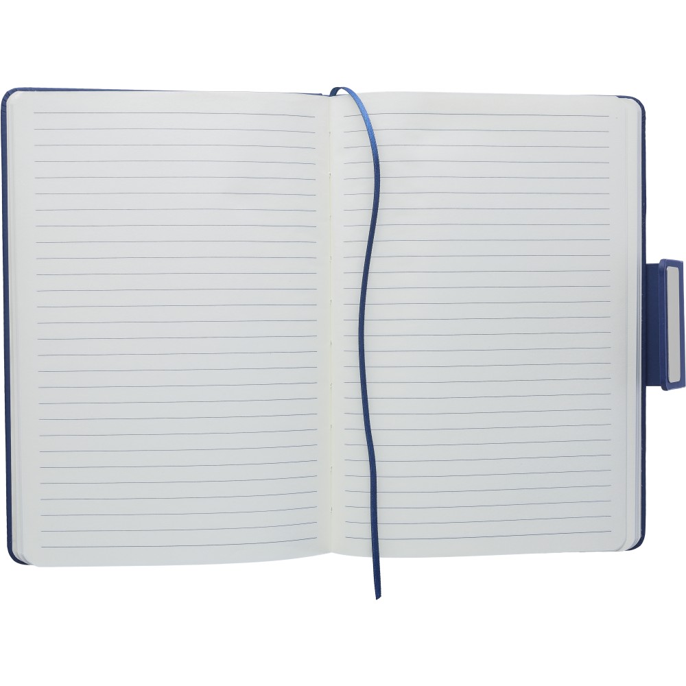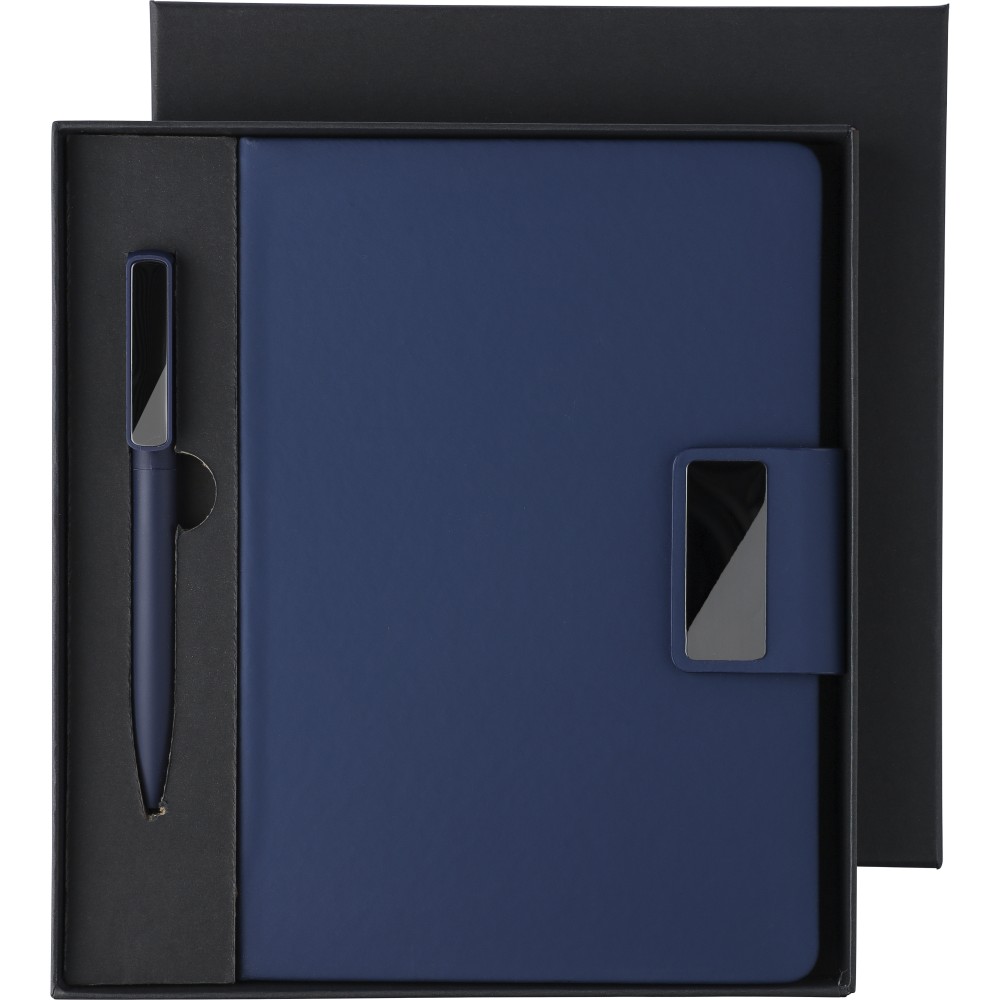 Karton ajándékkészlet. Tartalma: újrahasznosított alumínium csavaros golyóstoll kék tintával és újrahasznosított PU jegyzetfüzet. A jegyzetfüzet 80 lapos 70 g/m2-es vonalas papírral, és szalagos könyvjelzőt és fém mágneses zárat tartalmaz acélszürke gravírozott lappal. Mindkét termék újrahasznosított logóval van ellátva: dombornyomva a jegyzetfüzeten és gravírozva a tollon.