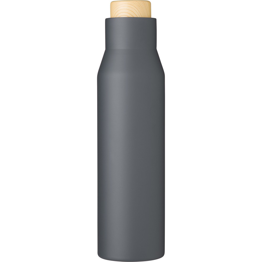 Rozsdamentes acél (s/s304), duplafalú palack fa tetővel. Barna kartondobozba egyedileg csomagolva. Űrtartalom: 500 ml.
