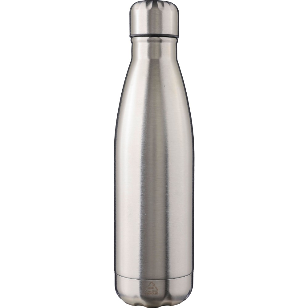 Újrahasznosított rozsdamentes acél, egyrétegű kulacs csavaros kupakkal. 304-es rozsdamentes acélból készült. Az újrahasznosított logó gravírozva van a kulacson. Egyenként barna kartondobozba csomagolva. Űrtartalom: 650 ml.