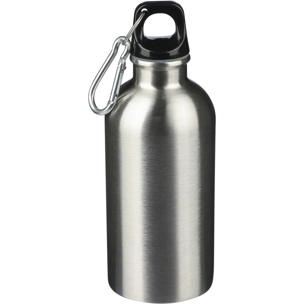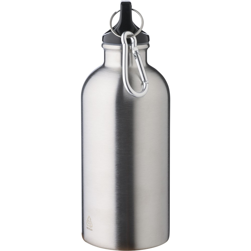 Újrahasznosított rozsdamentes acélból készült 400 ml-es szimplafalú kulacs PP kupakkal és alumínium karabinerrel. Az újrahasznosított anyagra utaló logó a palackra van gravírozva. Mosogatógépben nem tisztítható.