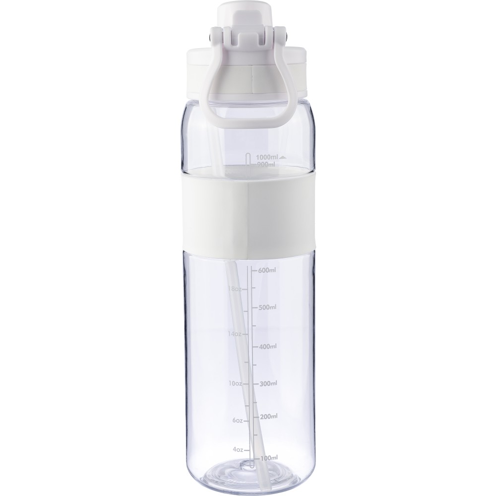 Tritán kulacs, 900 ml-es. Kétféle használati lehetőséggel: csavaros záródású kupak vagy visszahajtható végű szívószál. Szilikon markolattal, PP hordozófüllel és nyomtatott űrtartalom-jelzővel.